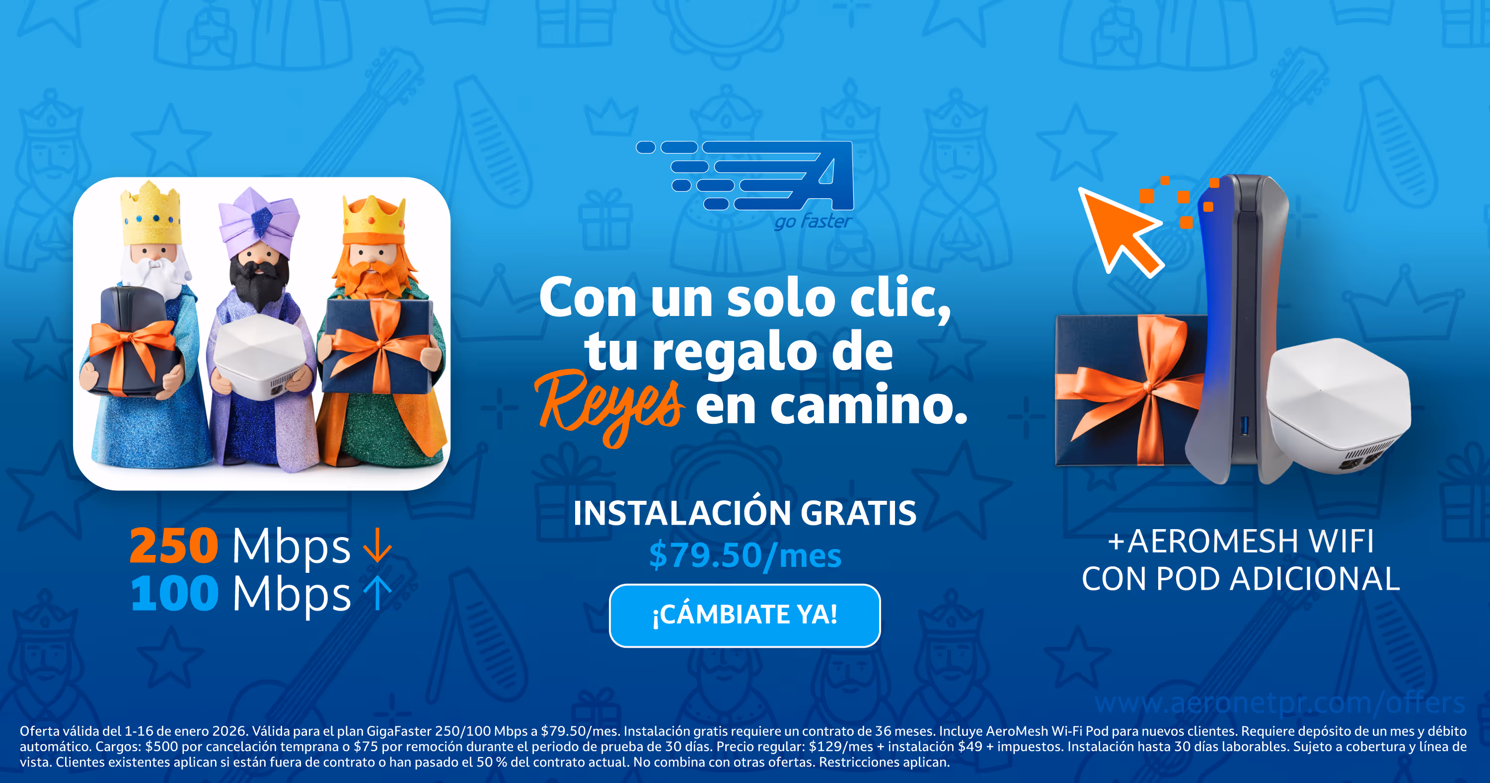 Terms and Conditions | Please read the offer terms and conditions carefully: Offer valid from January 1-16 2026. Free installation requires a 36-month service agreement. The promotional service plan is GigaFaster 250/100 Mbps. The promotional price of $79.50/month remains fixed for the entire 36-month contract duration. Cannot be combined with other offers, service plans, or discounts. The additional AeroMesh Wi-Fi Pod included in the offer applies only to new customers who subscribe to the promotional service plan. Not sold separately. If the customer cancels before the expiration date, a charge of $500 or the remaining contract balance, whichever is less, will apply. A deposit equivalent to 1 month of service is required at the time of order. This deposit is not an advance payment, but rather a security deposit held because no credit check is performed on the customer. Upon service activation, the current month’s charge will be prorated and charged on the same day of activation. Automatic debit via credit card or PayPal is required for monthly payments. Customers have a 30-day satisfaction period. If the customer decides to remove the service during this period, a $75 early removal charge will be applied to their account. Any relocation request will have a base fee of $100. Service availability will depend on coverage area and line of sight. Access to your service through Wi-Fi may result in reduced Internet speeds due to the type of equipment used, environmental and structural conditions in your home, the number of users, and other factors beyond AeroNet’s control. Regular installation price for GigaFaster service is $49.00 plus taxes. Regular price for the promotional service plan: GigaFaster Business 250/100 Mbps - $129.00 monthly. Regular AeroMesh WiFi price: $9.95 per month; setup charge: $49.95 plus taxes (one-time).Installations may take up to 30 business days due to the high volume of requests. Existing customers only qualify for this offer if they are already out of contract or have passed 50% of their current contract. Does not apply to purchases made before the start of this offer. Other restrictions may apply.
